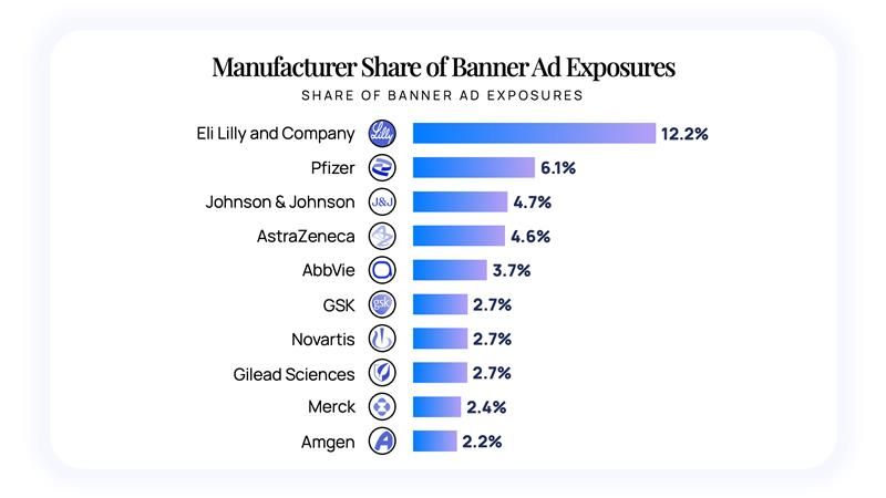 - The top 10 manufacturers captured 44% of all pharmaceutical banner ad exposures in Q3, led by Eli Lilly, Pfizer, J&J, and AstraZeneca.