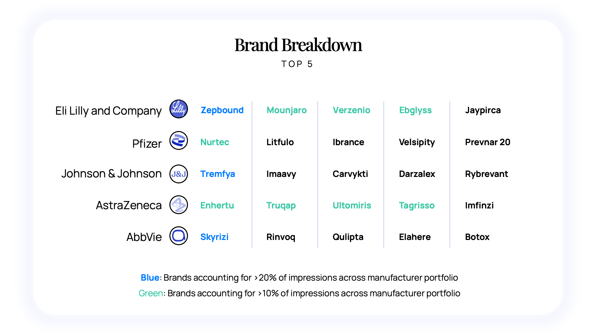 The top 10 manufacturers accounted for nearly half of all banner ad impressions, signaling a deliberate pivot toward concentrated digital dominance. Rather than dispersing investment across a broad range of brands, leading companies are building digital fortresses around flagship therapies and franchise-defining categories.